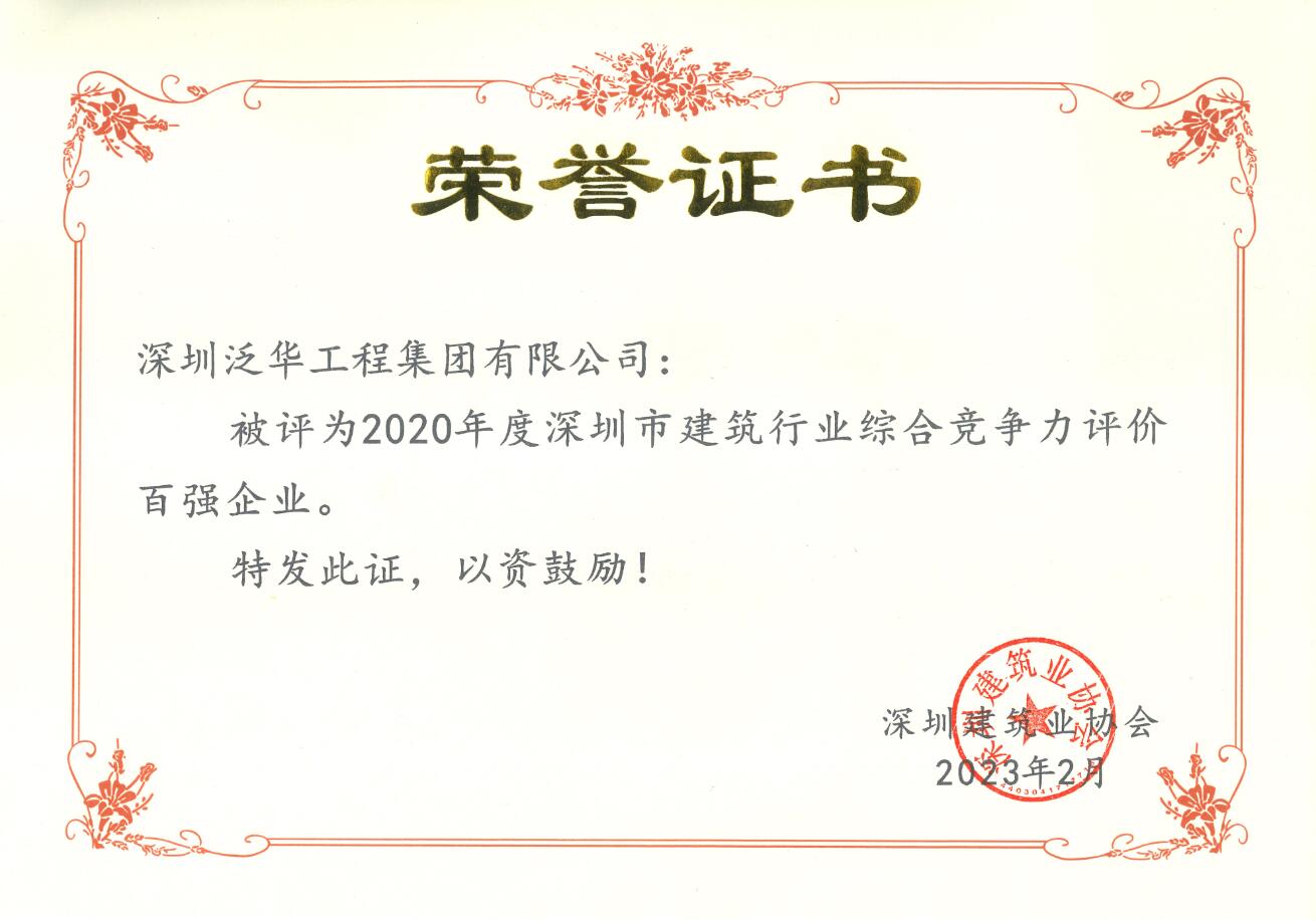 为引导深圳市建筑行业把握好发展阶段,实现高质量发展,深圳市建筑业协会于2022年8月八届二次会员代表大会上正式发布了《深圳市建筑行业综合竞争力评价分析报告(2021)》。经过综合评析,我司获评“2020年度深圳市建筑行业综合竞争力评价百强企业”。