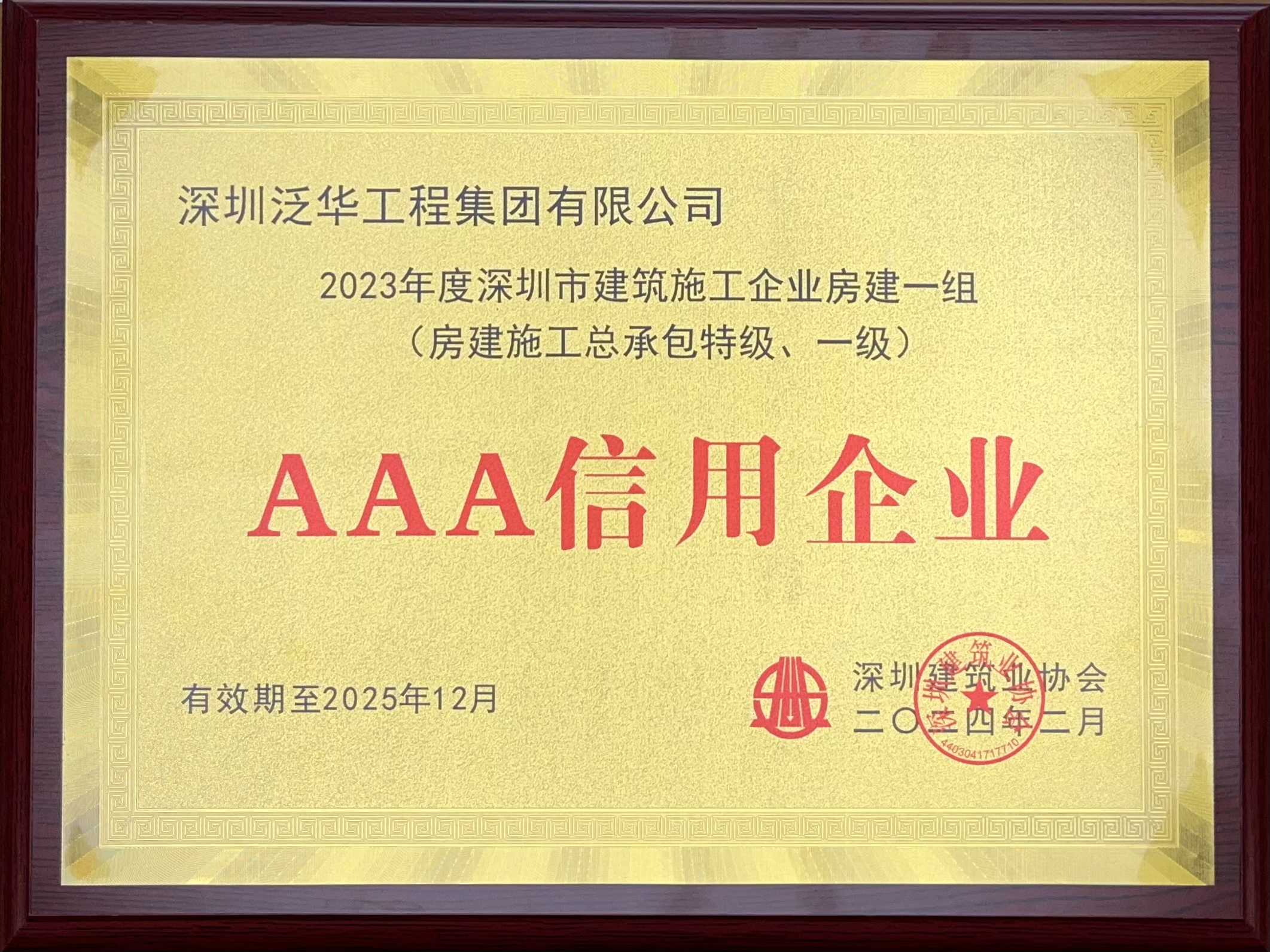 近日,我司荣获深圳市建筑业协会颁发的2023年度深圳市建筑施工企业房建一组(房建施工总承包特级、一级)“AAA信用企业”荣誉称号!