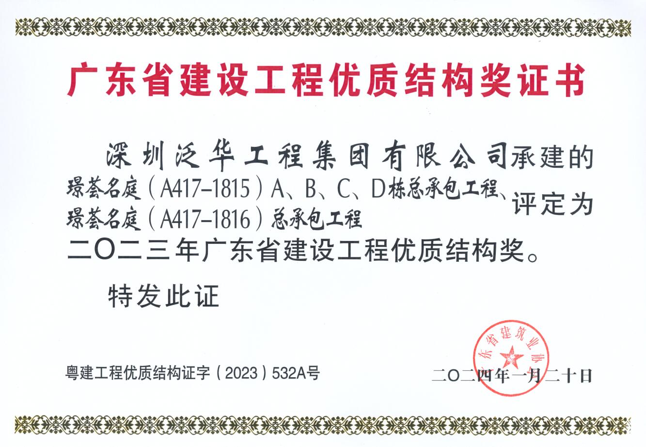 近日,通过专家组对企业申报项目的主体结构、施工管理等多个方面的严格检查及验收,经广东省建筑业协会工程质量工作委员会审定并面向社会完成公示,由我司承建的璟荟名庭项目荣获“2023年广东省建设工程优质结构奖”。