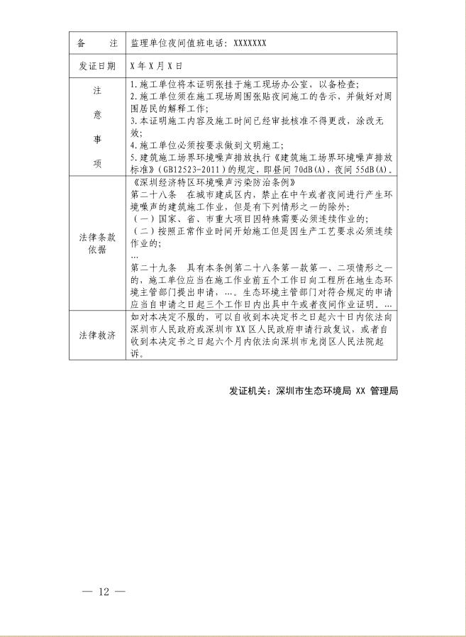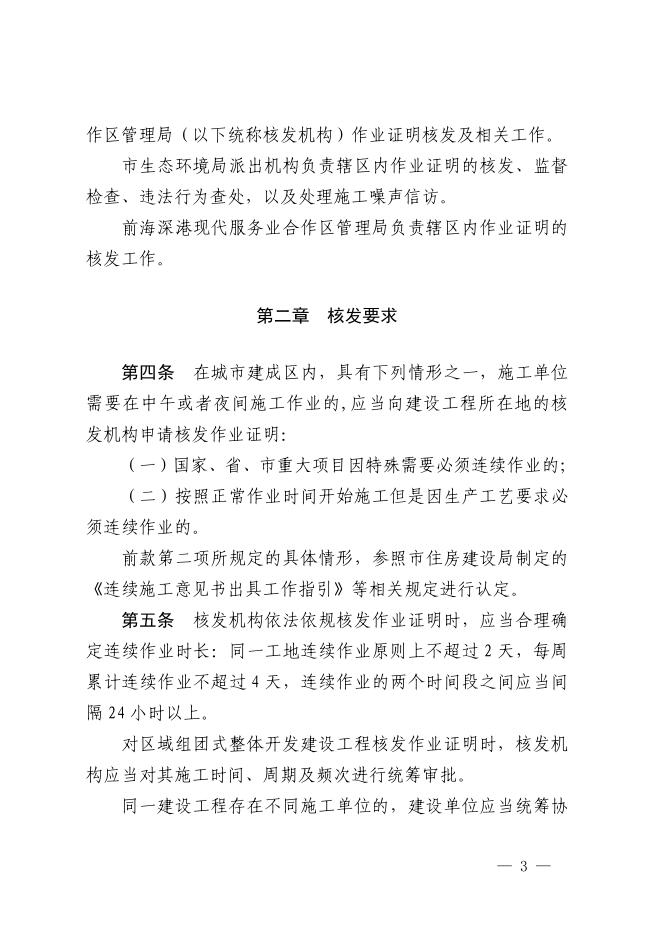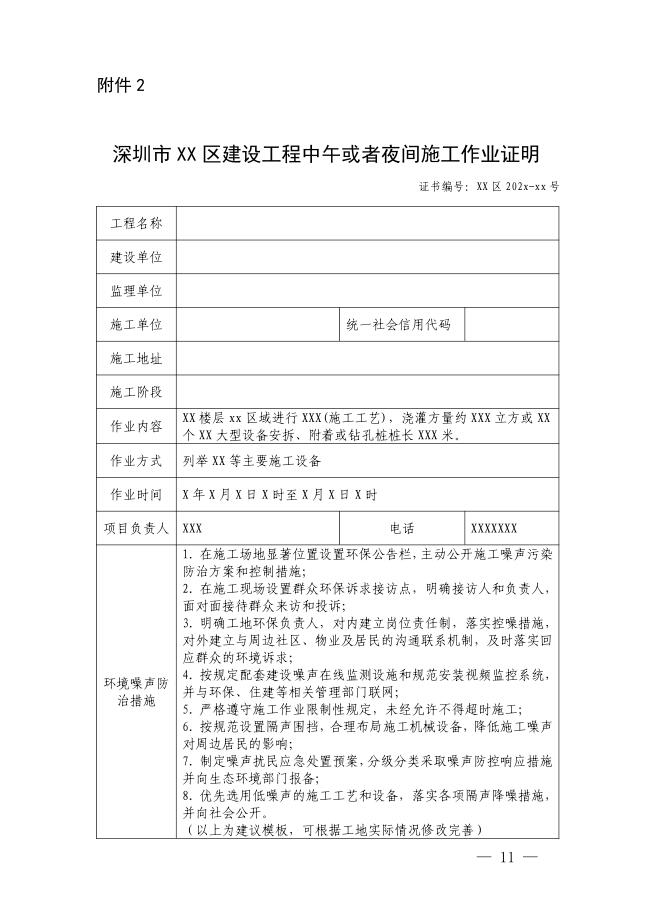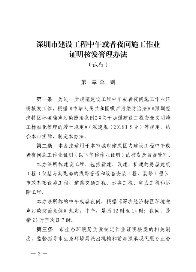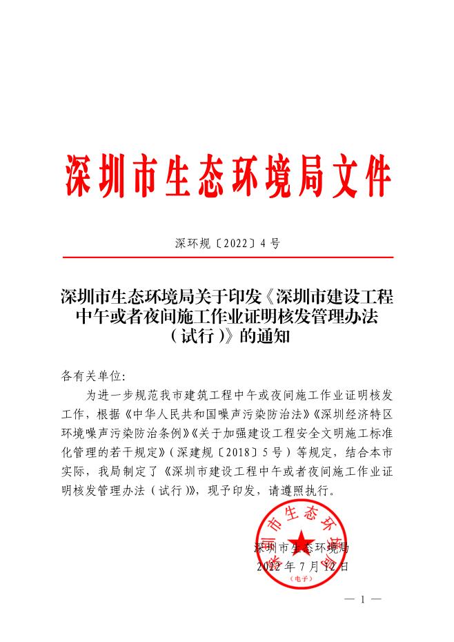 为进一步规范我市建筑工程中午或夜间施工作业证明核发工作,根据《中华人民共和国噪声污染防治法》、《深圳经济特区环境噪声污染防治条例》、《关于加强建设工程安全文明施工标准化管理的若干规定》(深建规〔2018〕5 号)等规定,结合本市实际,深圳市生态环境局制定了《深圳市建设工程中午或者夜间施工作业证明核发管理办法(试行)》,现予转发,请遵照执行。