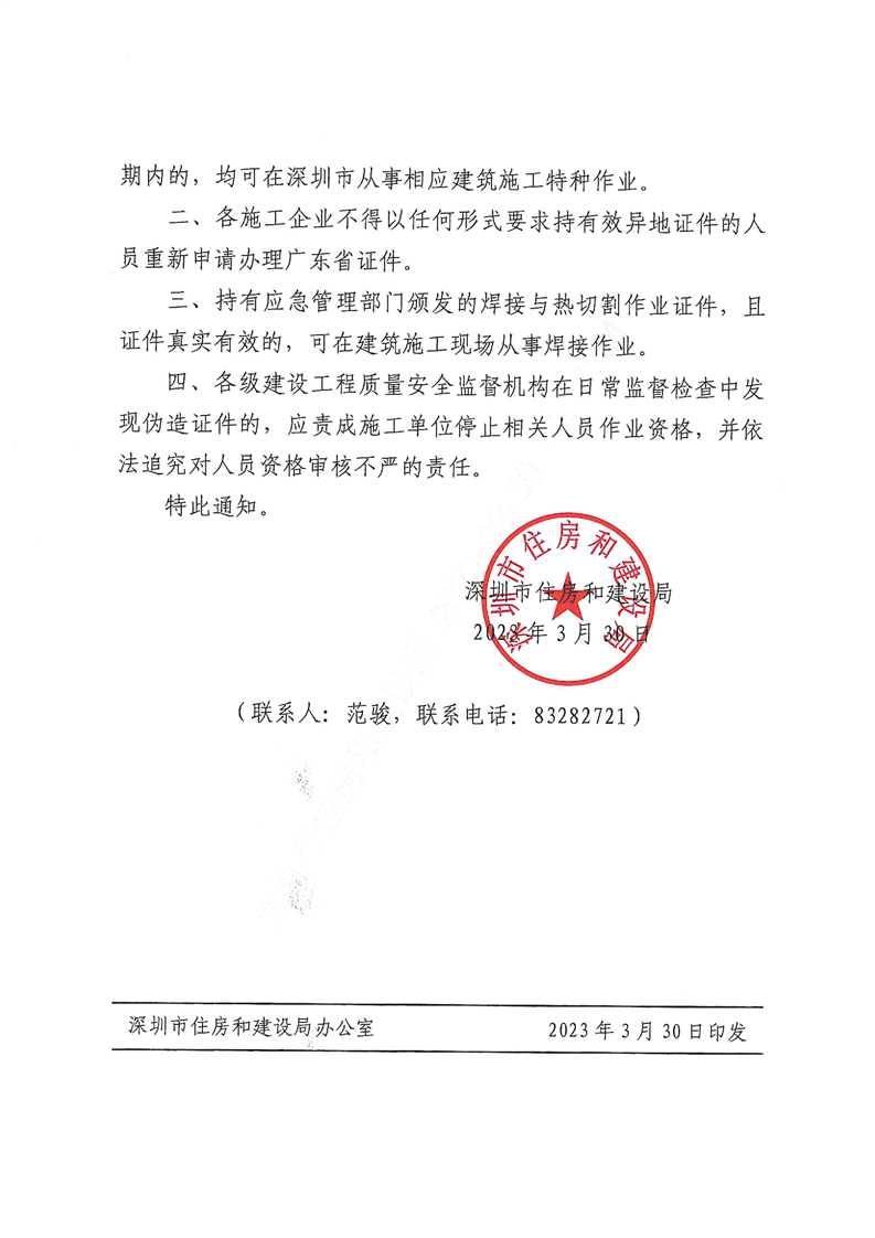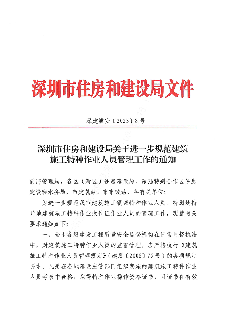 转发《深圳市住房和建设局关于进一步规范建筑施工特种作业人员管理的通知》