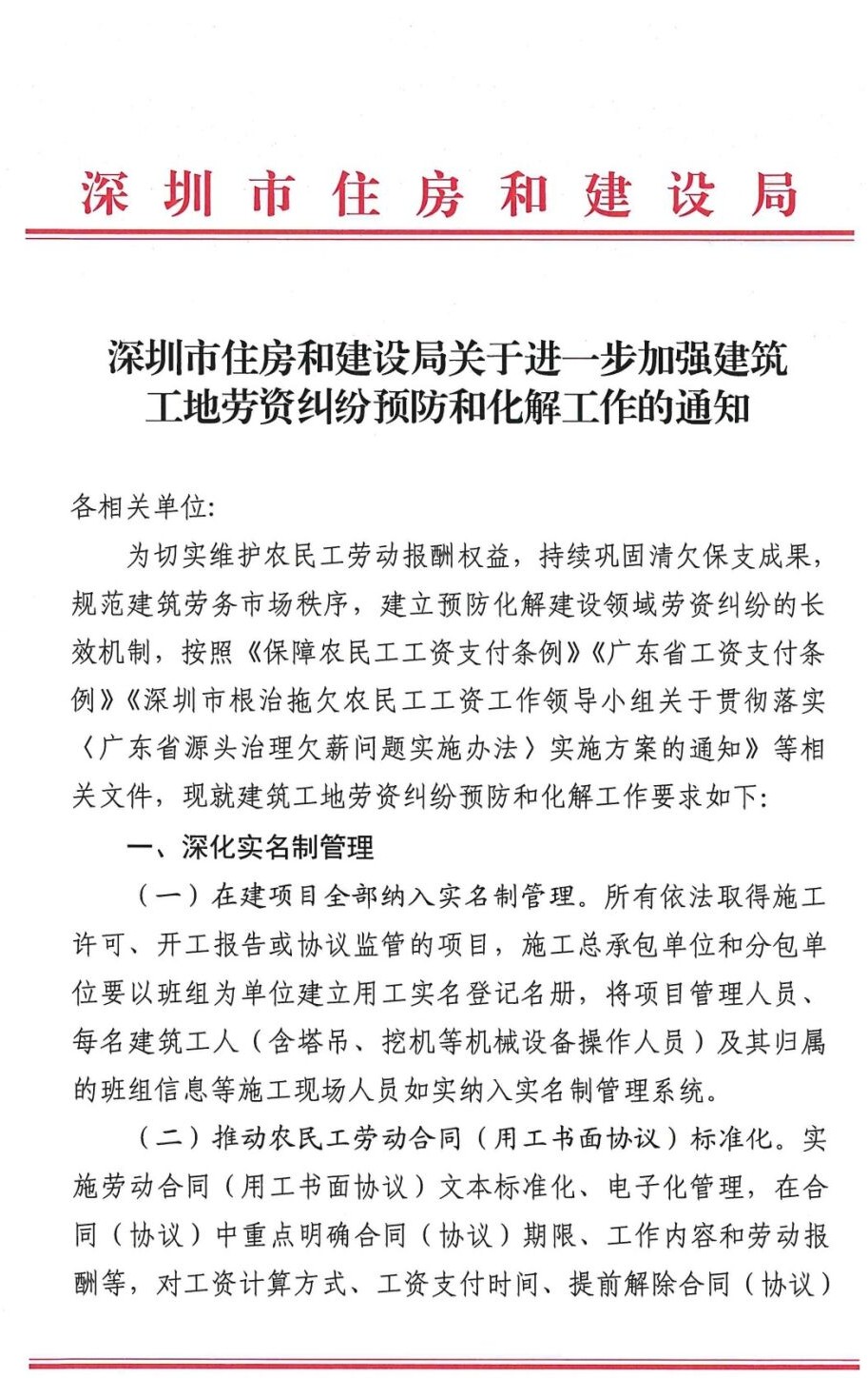 转发《深圳市住房和建设局关于进一步加强建筑工地劳资纠纷预防和化解工作的通知》