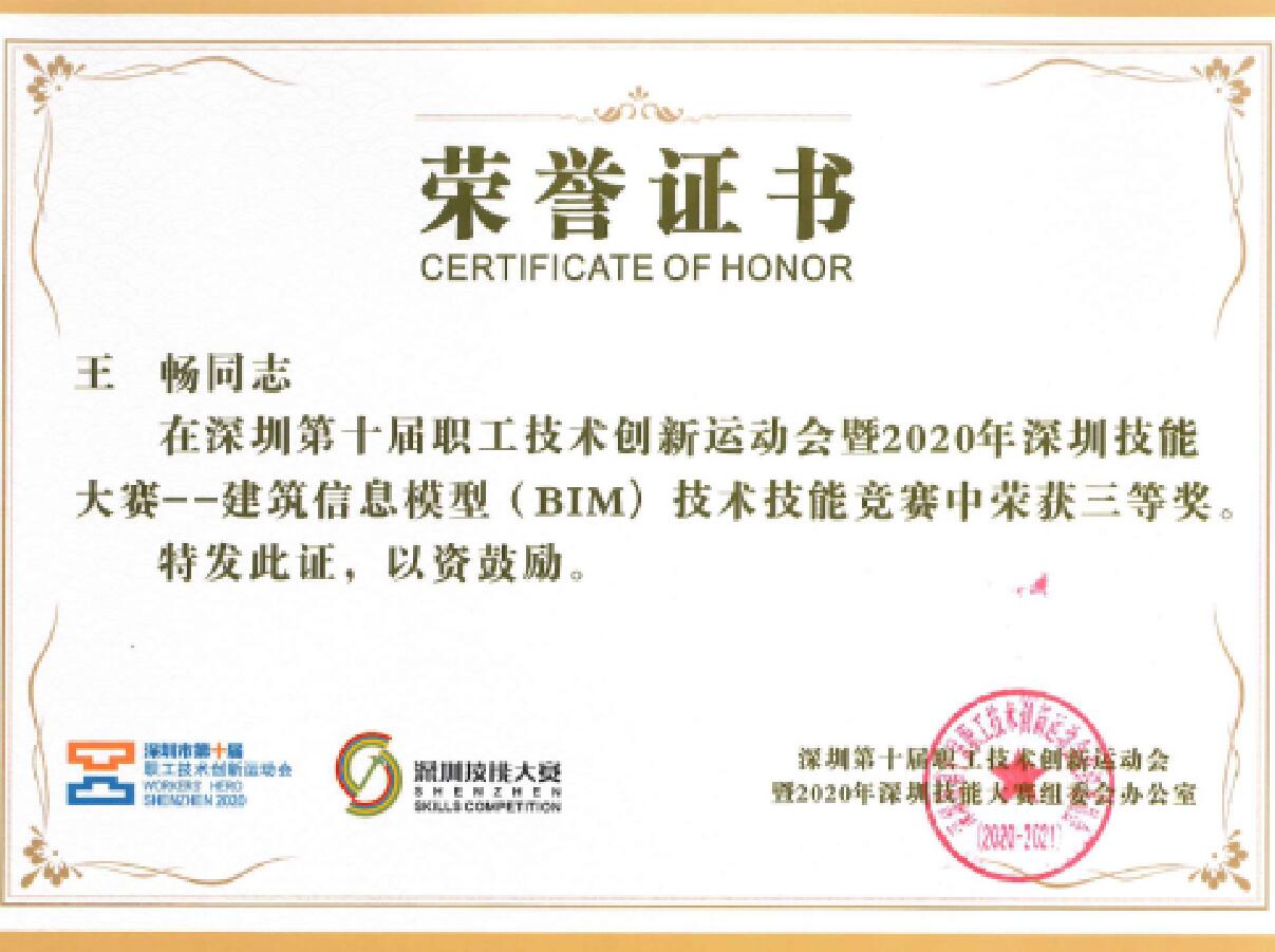 由深圳市总工会、深圳市人力资源和社会保障局、深圳市住房和建设局主办的“20020年深圳技能大赛-建筑信息模型(BIM)技术员技能大赛”圆满结束。在获奖率不足10%的赛制规则下,我司三名参赛人员王畅、杨荣、王志明取得佳绩,获得“深圳市经济技术创新能手”的称号,并获颁以下荣誉证书。