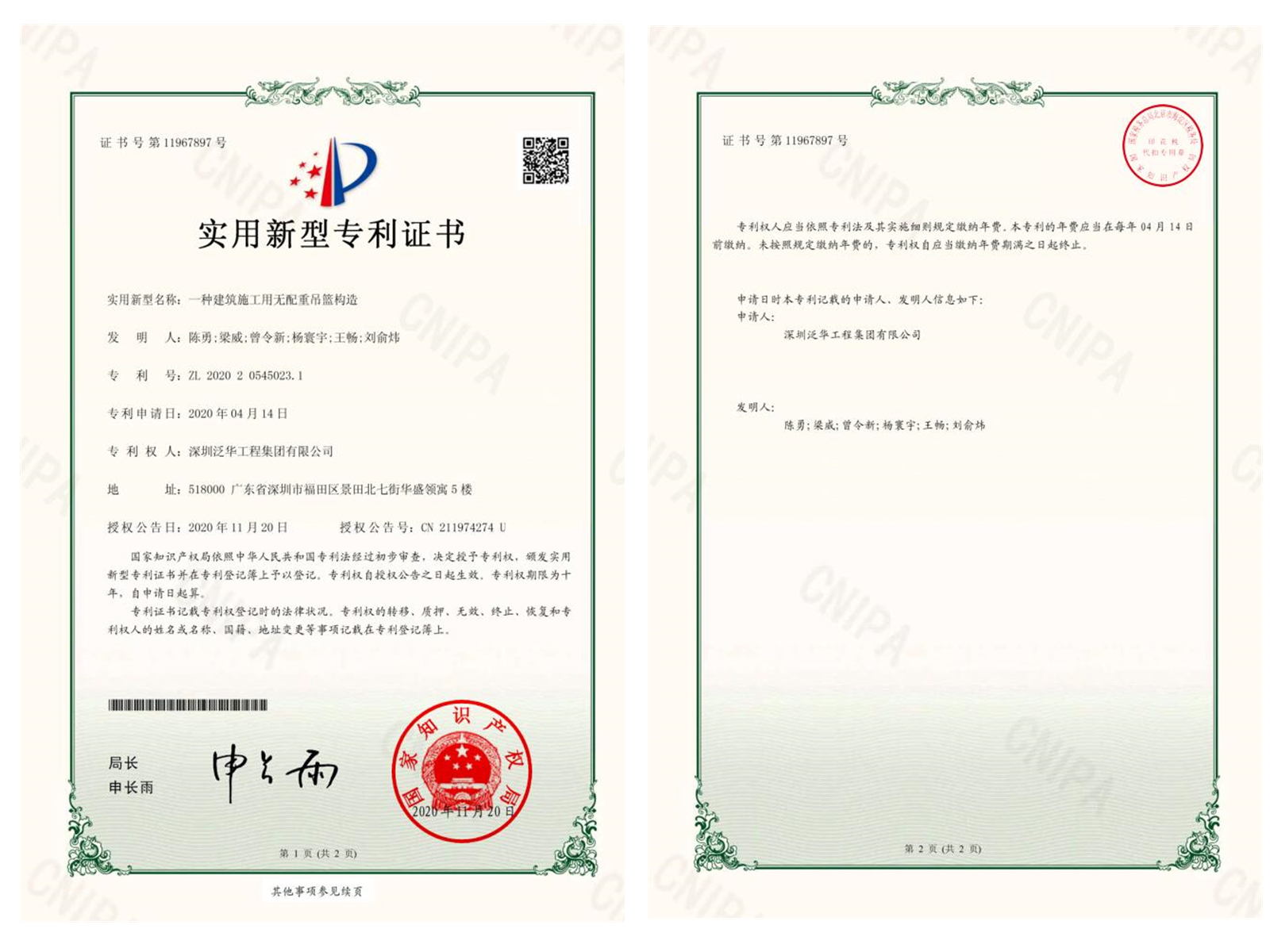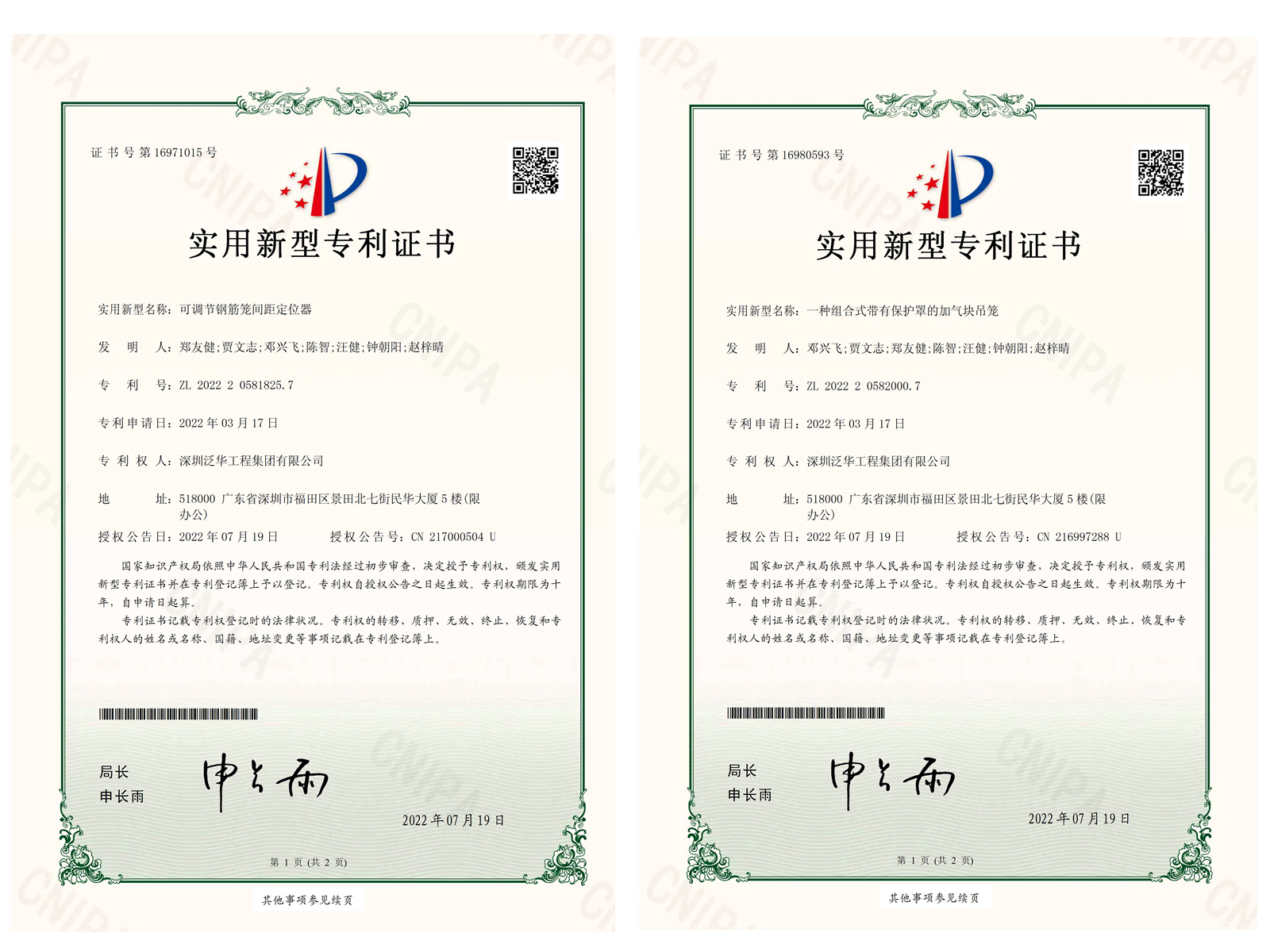 日前,我司恒兴御景园项目团队申报的两项实用新型专利已成功获得国家知识产权局授权,并获颁国家实用新型专利证书,专利名称为:《可调节钢筋笼间距定位器》、《一种组合式带有保护罩的加气块吊笼》。